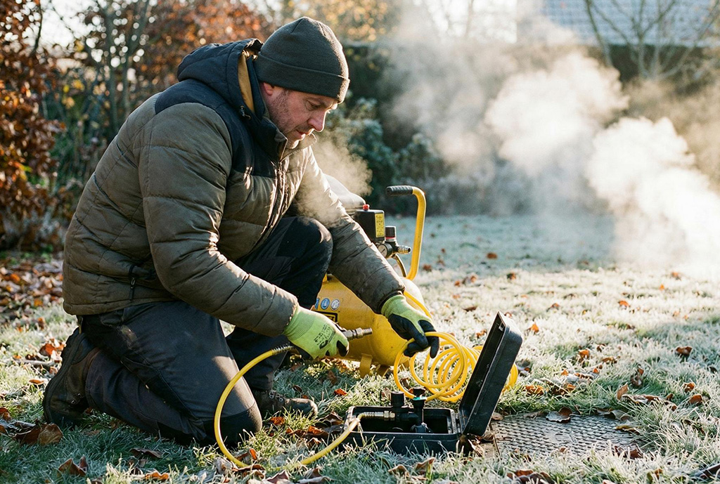 Professionelle Einwinterung einer Gartenbewässerung in Niederösterreich: Ein Techniker entleert das Bewässerungssystem mittels Druckluft, um Frostschäden an Leitungen und Ventilen vorzubeugen.