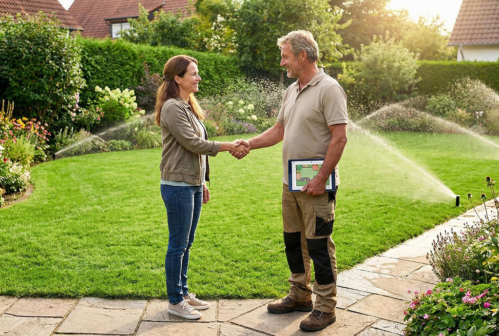 Individuelle Planung von automatischen Bewässerungssystemen durch WTC: Ein Experte berät einen Kunden in einem perfekt gepflegten, grünen Garten in Wien und Niederösterreich.